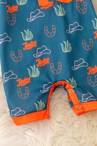 Expertly crafted for comfort and style, the Rodeo baby romper features a playful cactus print in bold blue and orange, perfect for your little one. Made with soft, breathable fabric and convenient snap closures, this romper is both practical and adorable. The perfect choice for your baby boy's wardrobe.